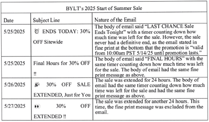 For example, a subject line that reads “30% off sale, today only!” becomes actionable if the discount is, in fact, not available for “today only.” In contrast, a subject line that reads “Best Deal of the Year” is hyperbole and not necessarily a misrepresentation, even if a better deal is later offered, because “market conditions change such that a better sale is later available.”[8]