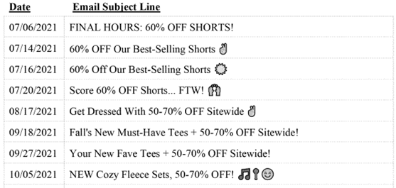 The Brown plaintiffs alleged that Old Navy violated CEMA by sending emails with false or misleading subject lines, causing them to open the messages and purchase items based on a false sense of urgency. For example, Old Navy sent emails with subject lines such as “GAH! This is the last chance to get up to 50% OFF.” But the next day, the plaintiffs received an email with a subject line stating, “We’ve announced UP TO 50% OFF STOREWIDE (starting now).”[1] The plaintiffs claimed that these emails were false and misleading because the announced 50% offer was available for longer than the time stated in the original email’s subject line. The Complaint also targeted emails with subject lines suggesting that offers were available for longer than the time stated in the subject line, an old offer was new, and those that falsely stated that a promotion or offer was extended.